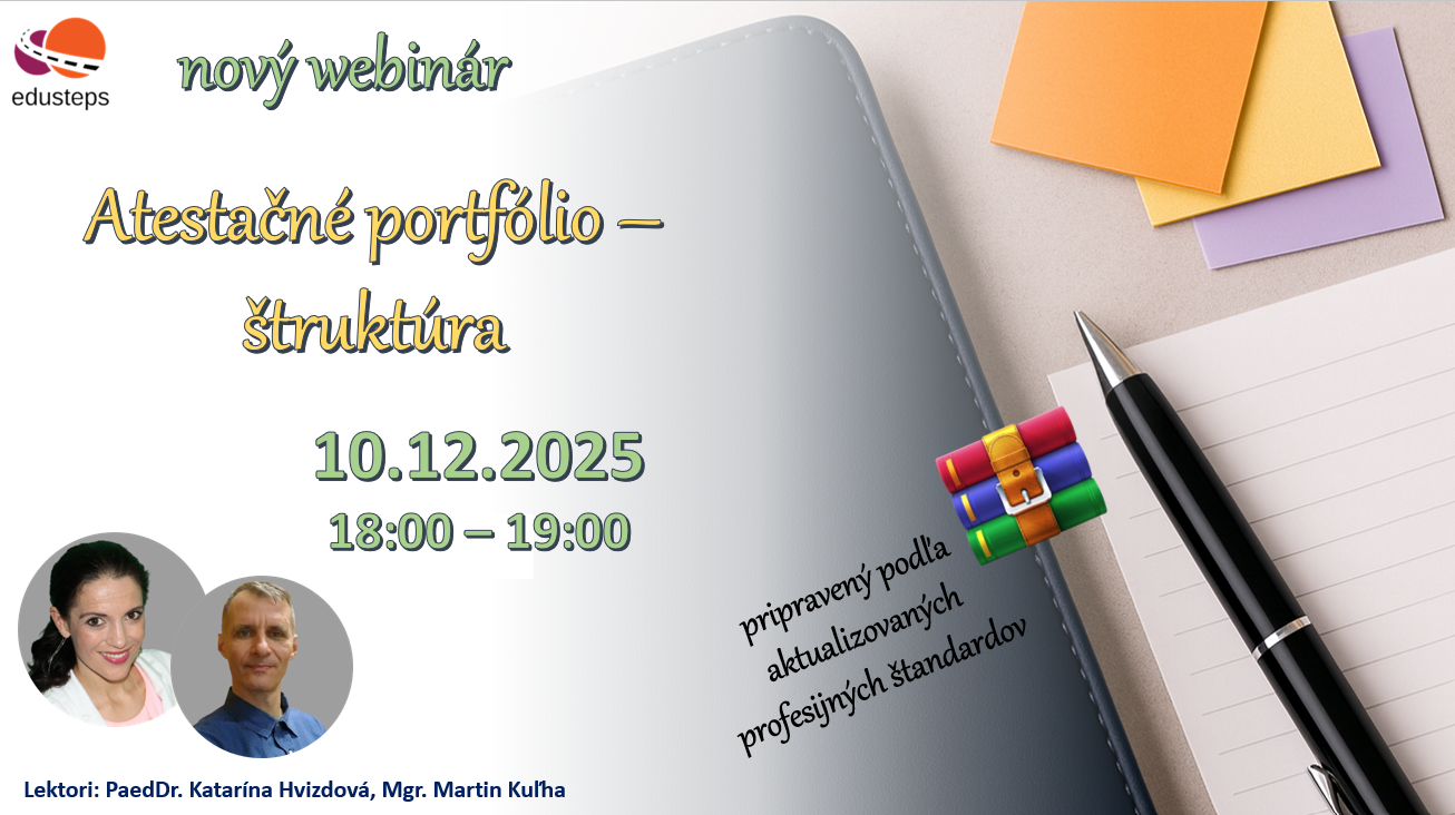 Atestačné portfólio je téma, ktorá stále rezonuje. Webinár je spracovaný podľa nových profesijných štandardov vydaných MŠVVaM SR a zameriava sa najmä na to, ako im porozumieť a ako sa premietajú do štruktúry atestačného portfólia Účastníci získajú jasný prehľad o tom, ako je portfólio usporiadané, aké časti má obsahovať a ako jednotlivé kompetencie tvoria základ pre jeho vytvorenie. Ukážeme si modelovú štruktúru portfólia krok po kroku a poukážeme na najdôležitejšie zmeny, ktoré priniesla novela zákona o PZ/OZ. Webinár je určený pre učiteľov MŠ, ZŠ aj SŠ.