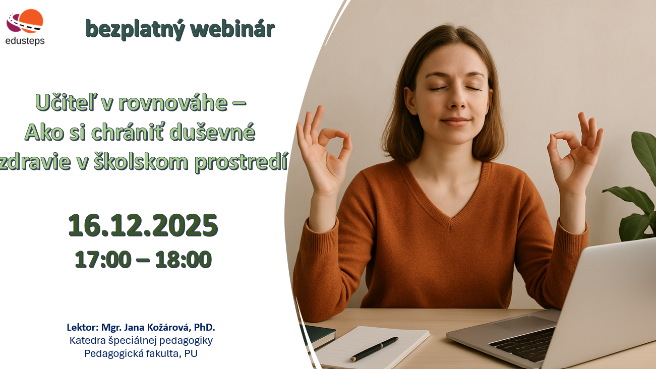 Byť pedagógom či odborným zamestnancom znamená veľkú zodpovednosť – no aj tlak, stres a vyčerpanie. Tento webinár vám ukáže, ako rozpoznať signály preťaženia, nastaviť hranice a nájsť rovnováhu medzi prácou a osobným životom. Spoločne objavíme praktické techniky na zvládanie stresu a podporu psychickej pohody. Ukážeme si aj jednoduché každodenné návyky, ktoré dokážu zásadne zlepšiť vašu odolnosť a celkovú pohodu. Vaše duševné zdravie je základom kvalitnej práce – neučte sa ho chrániť.
