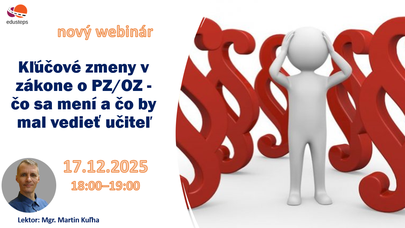 Legislatíva pre pedagogických a odborných zamestnancov prešla v poslednom období niekoľkými zmenami – niektoré už platia, ďalšie vstúpia do účinnosti od 01.09.2026. V spleti paragrafov sa však učitelia často strácajú. Webinár ponúkne prehľadné, zrozumiteľné a praktické vysvetlenie toho najdôležitejšieho zo zákona o PZ/OZ, ktoré potrebuje poznať každý pedagóg. Pozrieme sa na aktuálne aj pripravované zmeny, pracovnoprávne súvislosti, profesijný rozvoj, aktualizačné a inovačné vzdelávania, nové profesijné štandardy aj atestácie. Získate istotu v tom, čo sa mení.