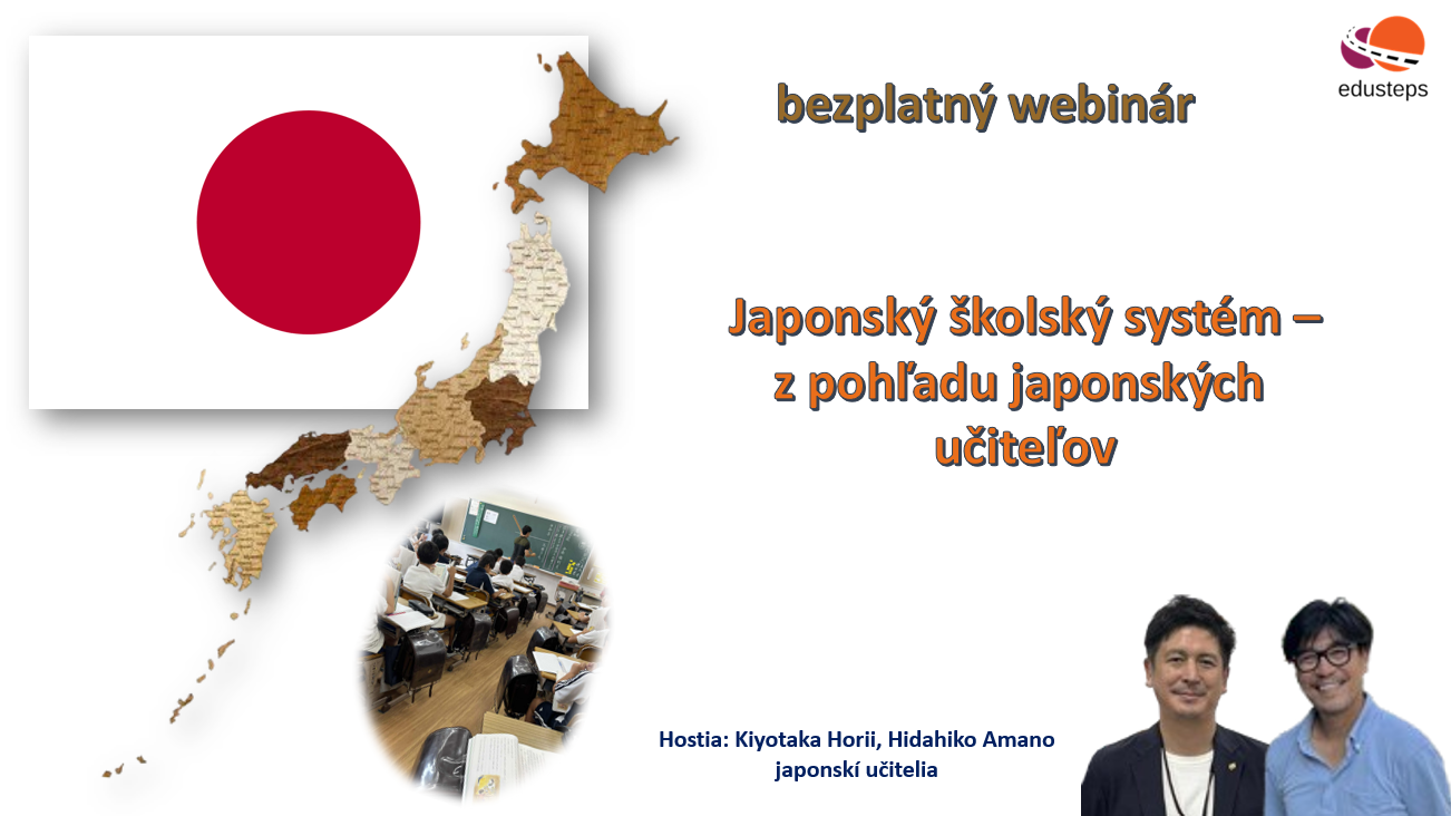 Aký je v skutočnosti školský systém v Japonsku? Ako vyzerá každodenný život žiakov a učiteľov v krajine, ktorá spája tradíciu s inováciami? Počas webinára sa o svoje skúsenosti podelíme spolu s japonskými učiteľmi Kiyotakom Horiim a Hidehikom Amanom, ktorí priblížia fungovanie škôl, prístup k žiakom aj profesijný rozvoj učiteľov. Spoločne sa pozrieme na to, čo robí japonské školstvo jedinečným a čím by sme sa mohli inšpirovať. Ak sa chcete niečo opýtať, napíšte svoju otázku do registračného formulára.