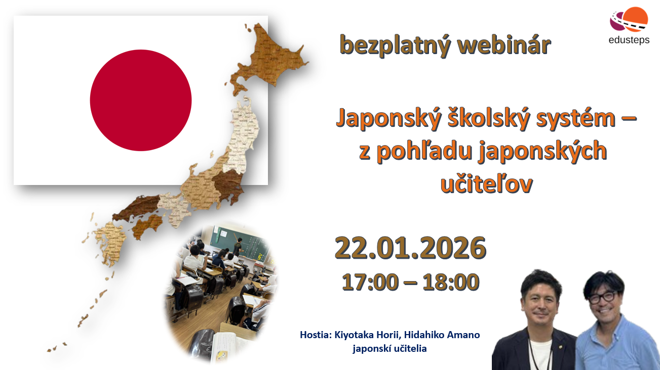 Aký je v skutočnosti školský systém v Japonsku? Ako vyzerá každodenný život žiakov a učiteľov v krajine, ktorá spája tradíciu s inováciami? Počas webinára sa o svoje skúsenosti podelíme spolu s japonskými učiteľmi Kiyotakom Horiim a Hidehikom Amanom, ktorí priblížia fungovanie škôl, prístup k žiakom aj profesijný rozvoj učiteľov. Spoločne sa pozrieme na to, čo robí japonské školstvo jedinečným a čím by sme sa mohli inšpirovať. Ak sa chcete niečo opýtať, napíšte svoju otázku do registračného formulára.