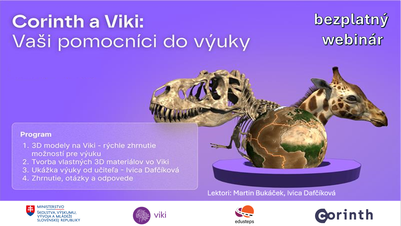 Pozývame vás na webinár, kde si spoločne ukážeme, ako jednoducho a kreatívne využívať 3D modely na platforme Viki. Čakajú vás praktické ukážky, konkrétne postupy aj priestor na všetky vaše otázky. Webinár povedú Martin Bukáček, odborník na vzdelávacie technológie z tímu Corinth, a Ivica Dafčíková, učiteľka geografie a biológie známa svojím inovatívnym prístupom k výučbe a využívaním 3D modelov. Spoločne vám ponúknu inšpiráciu, interaktívny obsah a nový pohľad na učenie, ktorý vtiahne žiakov do sveta objavovania a podporí ich zvedavosť aj radosť z poznávania.