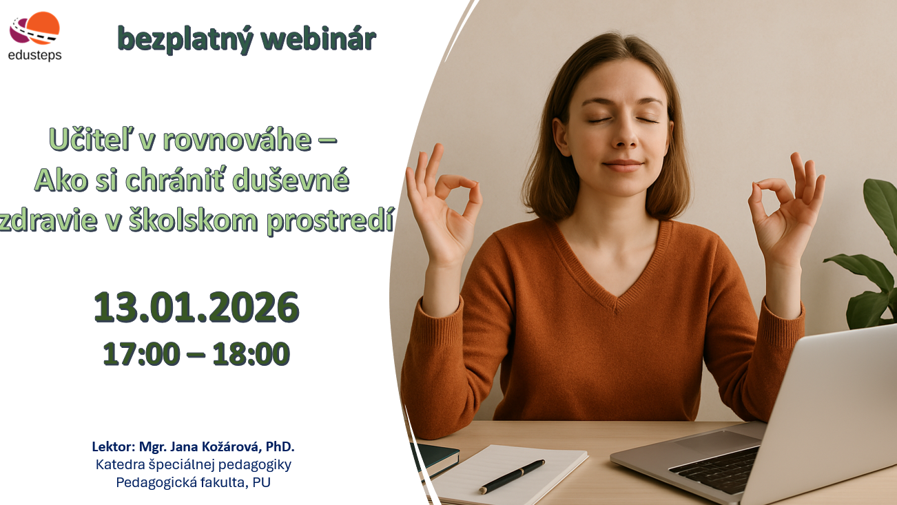 Byť pedagógom či odborným zamestnancom znamená veľkú zodpovednosť – no aj tlak, stres a vyčerpanie. Tento webinár vám ukáže, ako rozpoznať signály preťaženia, nastaviť hranice a nájsť rovnováhu medzi prácou a osobným životom. Spoločne objavíme praktické techniky na zvládanie stresu a podporu psychickej pohody. Ukážeme si aj jednoduché každodenné návyky, ktoré dokážu zásadne zlepšiť vašu odolnosť a celkovú pohodu. Vaše duševné zdravie je základom kvalitnej práce – neučte sa ho chrániť.
